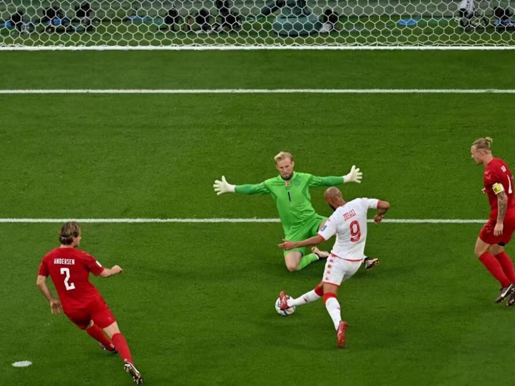 Pasi asgjë nuk kishte ardhur nga një dërgim i shkëlqyer në zonë nga një goditje dënimi e Christian Eriksen, Issam Jebali shënoi për Tunizinë, por tentativa u anulua për një pozicion të qartë jashtë loje. Pak para pushimit, Schmeichel u thirr sërish në aksion, duke u përhapur gjerësisht për të shpëtuar një gol pothuajse të sigurt nga Jebali.